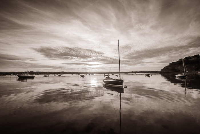 Coucher de soleil à Saint-Suliac, voilier et doris